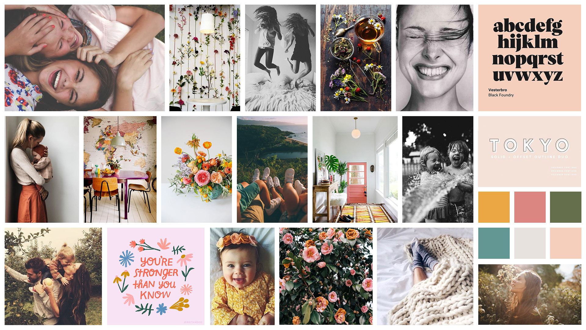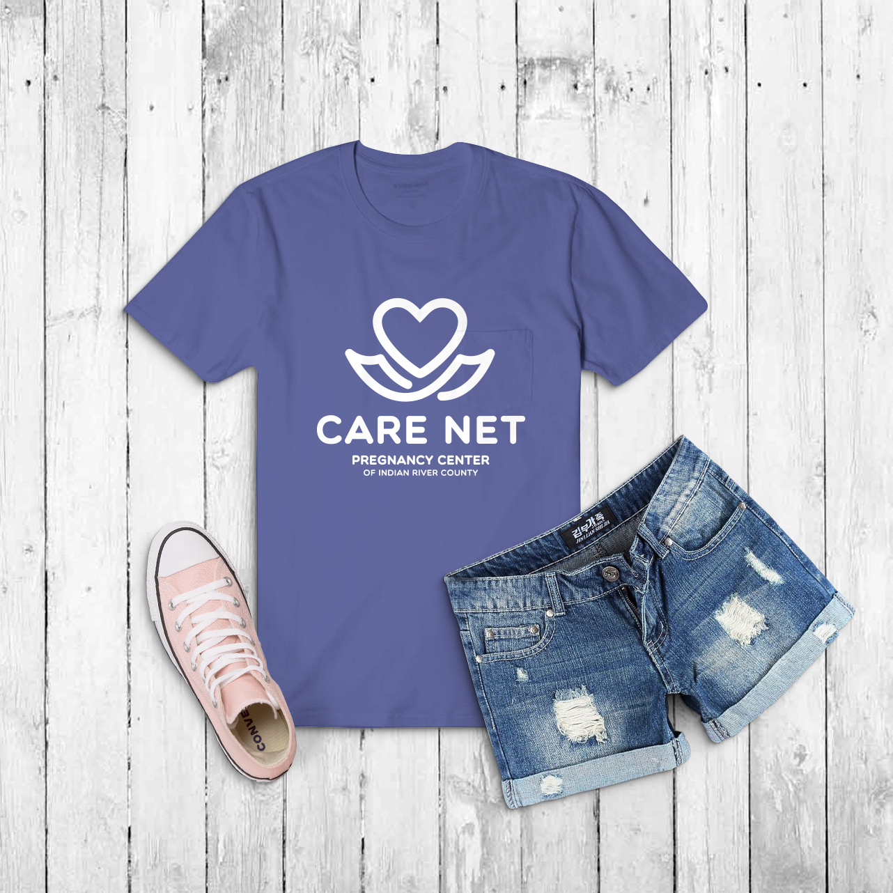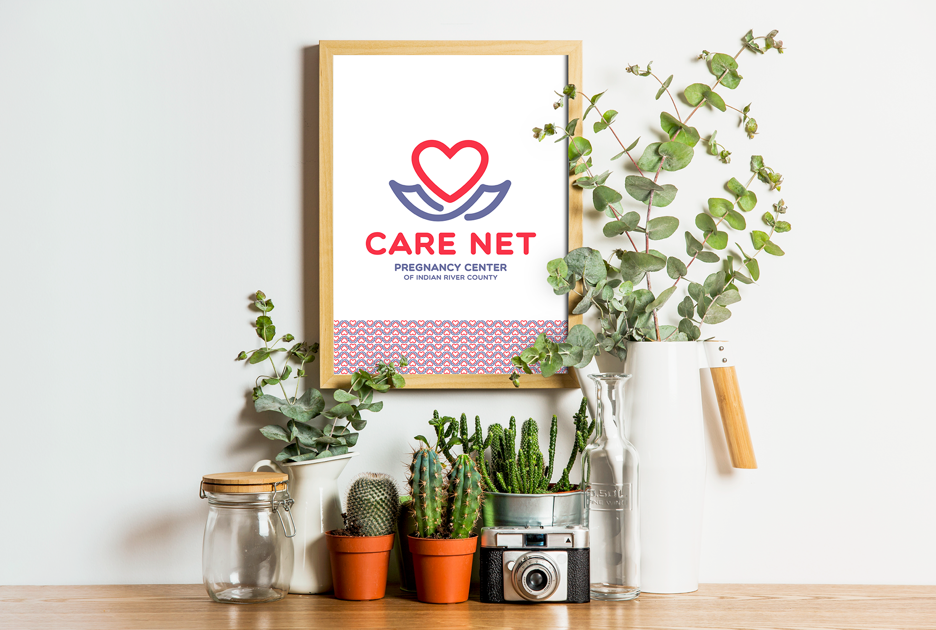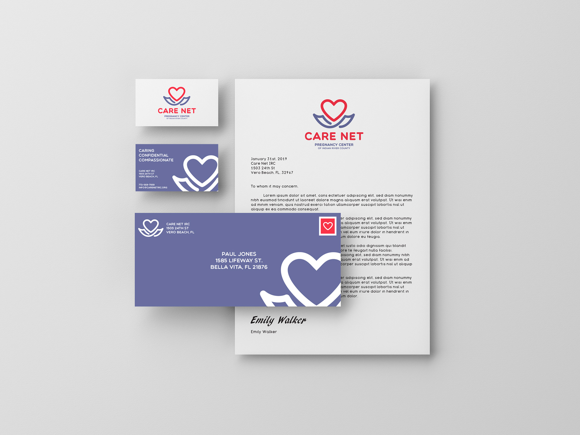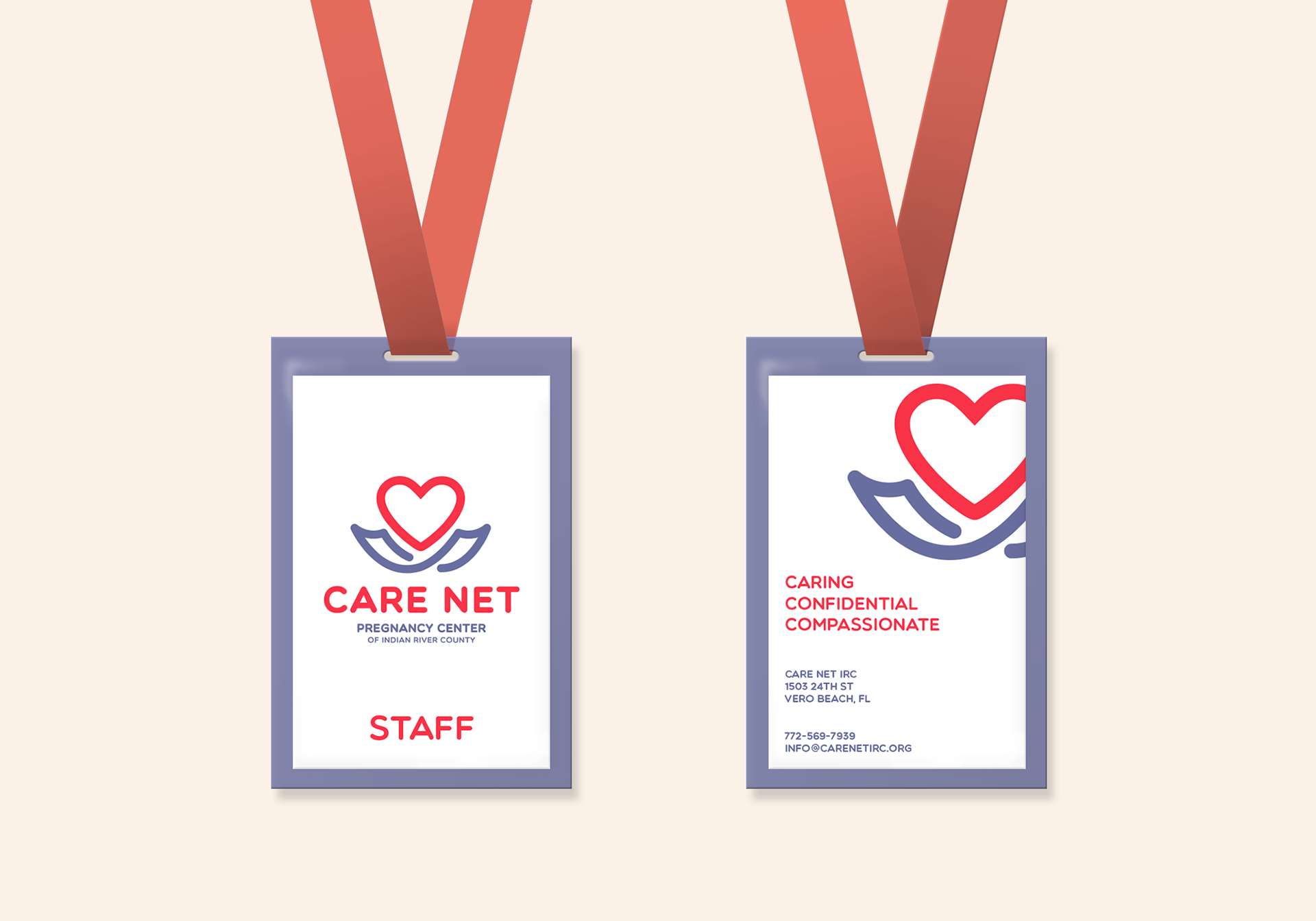 The red heart represents love and warmth, and the blue net/blanket symbolizes care and calmness. The design elements, from the imagery to words, are rounded, soft, and nonthreatening.